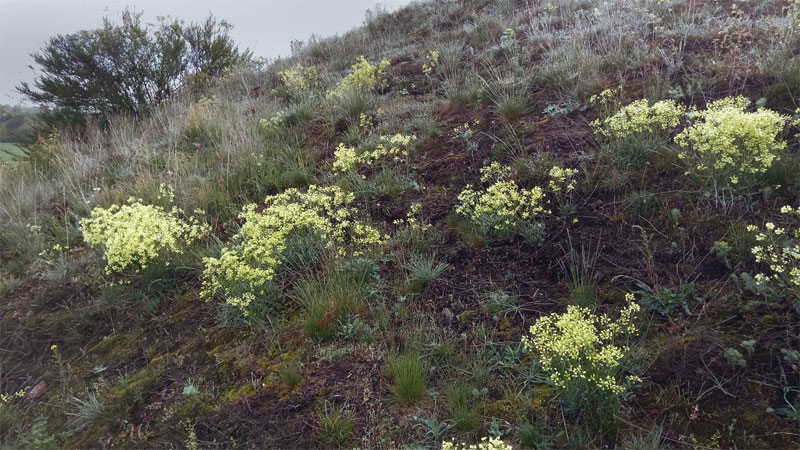 Wir fanden sogleich auf einem Felsen die Pflanze (Ausdauernder Knäul), an der die Polnische Schildlaus lebt, aus der sich ein teurer roter Farbstoff gewinnen lässt. Genutzt ehemals beispielsweise für Lippenstift, heute weitgehend von synthetischen Azo-Farbstoffen ersetzt. Die absolute Ziel-Art der Wanderung, den Felsen-Goldstern, sahen wir immer wieder in mal kleinen, mal großen Gruppen, weithin leuchtend.