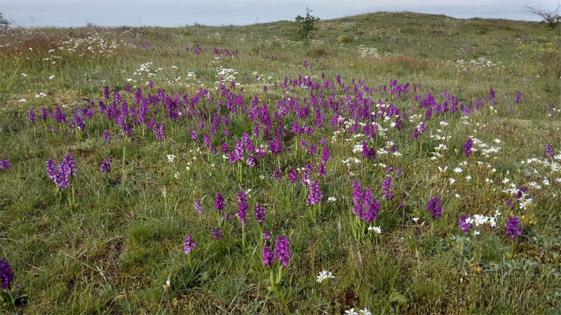 Wir sehen das Kleine Knabenkraut in riesigen Beständen und auf dem Höhepunkt der Blüte. Ein versprochen unvergesslicher Anblick! Weiterhin das stark bestandsgefährdete Zierliche Brillenschötchen, das weltweit nur in Sachsen-Anhalt vorkommt. Dann Gänsesterbe und zuletzt das Weiße Fingerkraut, auch diese Arten auf dem Höhepunkt ihrer Blüte.